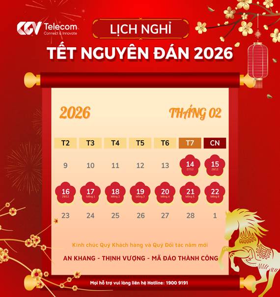 Hòa chung không khí rộn ràng chào đón năm mới Tết Nguyên Đán Bính Ngọ 2026, CGV Telecom xin trân trọng gửi đến Quý Khách hàng và Quý Đối tác lời chào trân trọng cùng lời cảm ơn chân thành nhất vì đã luôn tin tưởng, lựa chọn và đồng hành cùng chúng tôi trong suốt thời gian qua.