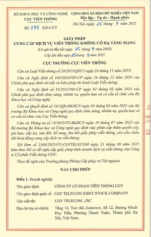 Ngày 25/9/2025, Công ty Cổ phần Viễn thông CGV được Bộ Khoa học và Công nghệ – Cục Viễn thông cấp Giấy phép cung cấp dịch vụ viễn thông di động mặt đất không có hạ tầng.